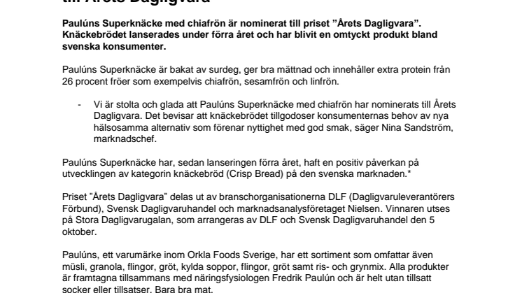 - Vi är stolta och glada att Paulúns Superknäcke med chiafrön har nominerats till Årets Dagligvara. Det bevisar att knäckebrödet tillgodoser konsumenternas behov av nya hälsosamma alternativ som förenar nyttighet med god smak, säger Nina Sandström, marknadschef.