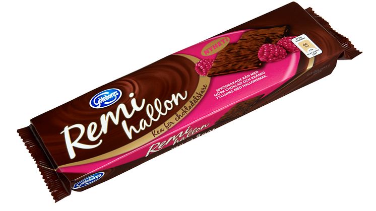 Remi Hallon är en nyhet med smak av mörk choklad och friska hallon. Ett lyxigare chokladkex baserat på sprödbakade rån för dem som vill unna sig det lilla extra. Remi är en klassiker som lanserades redan på 60-talet och som nu finns i smakerna hallon, mint och nougat.