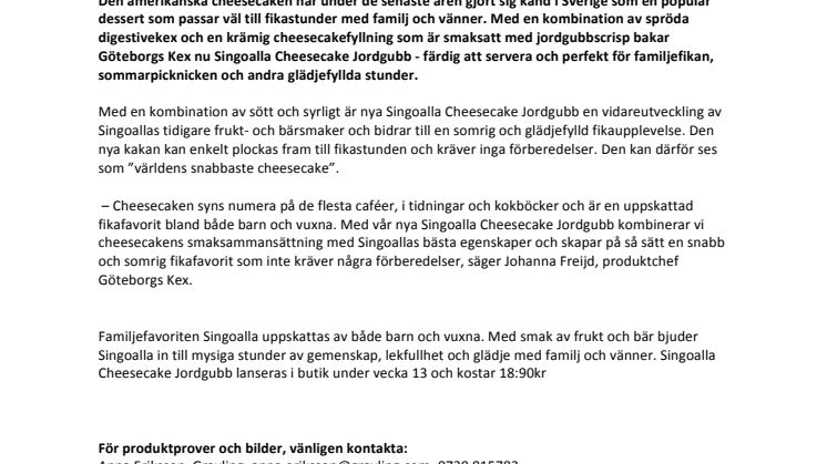 – Cheesecaken syns numera på de flesta caféer, i tidningar och kokböcker och är en uppskattad fikafavorit bland både barn och vuxna. Med vår nya Singoalla Cheesecake Jordgubb kombinerar vi cheesecakens smaksammansättning med Singoallas bästa egenskaper och skapar på så sätt en snabb och somrig fikafavorit som inte kräver några förberedelser, säger Johanna Freijd, produktchef Göteborgs Kex.