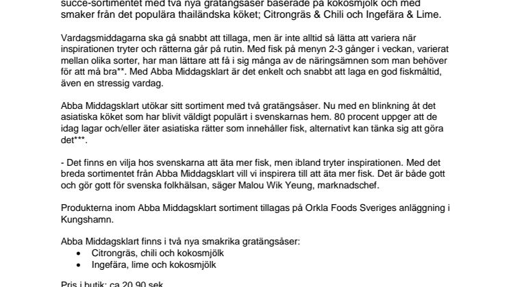 Abba Middagsklart utökar sitt sortiment med två gratängsåser. Nu med en blinkning åt det asiatiska köket som har blivit väldigt populärt i svenskarnas hem. 80 procent uppger att de idag lagar och/eller äter asiatiska rätter som innehåller fisk, alternativt kan tänka sig att göra det***.