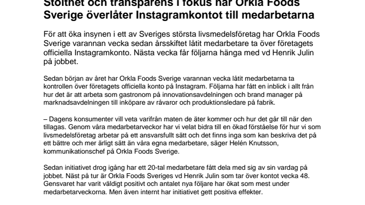 För att öka insynen i ett av Sveriges största livsmedelsföretag har Orkla Foods Sverige varannan vecka sedan årsskiftet låtit medarbetare ta över företagets officiella Instagramkonto. Nästa vecka får följarna hänga med vd Henrik Julin på jobbet.