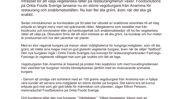 - Genom att utvidga vårt sortiment med en 100 grams vegoburgare från Anamma kan vi hjälpa våra kunder att servera sina matgäster en större storlek på burgare. Det känns bra att kunna erbjuda god mat som gör gott både för människan och planeten, säger Ellinor Persson, marknadschef FoodSolutions på Orkla Foods Sverige.