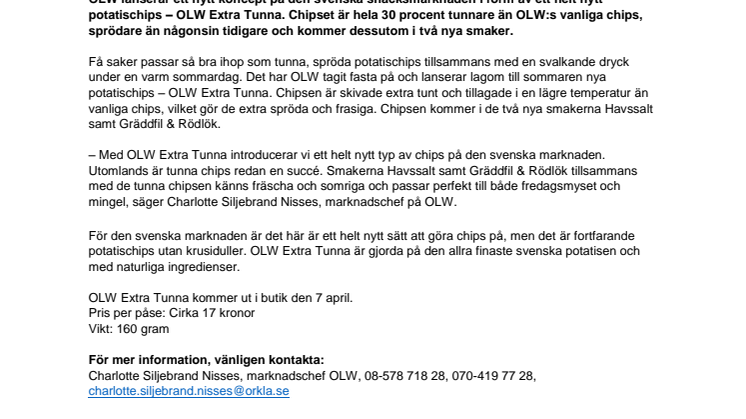 – Med OLW Extra Tunna introducerar vi ett helt nytt typ av chips på den svenska marknaden. Utomlands är tunna chips redan en succé. Smakerna Havssalt samt Gräddfil & Rödlök tillsammans med de tunna chipsen känns fräscha och somriga och passar perfekt till både fredagsmyset och mingel, säger Charlotte Siljebrand Nisses, marknadschef på OLW.