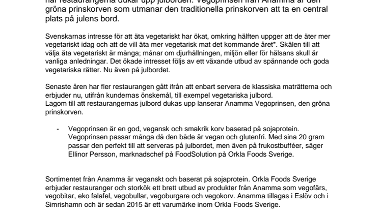 Lagom till att restaurangernas julbord dukas upp lanserar Anamma Vegoprinsen, den gröna prinskorven.