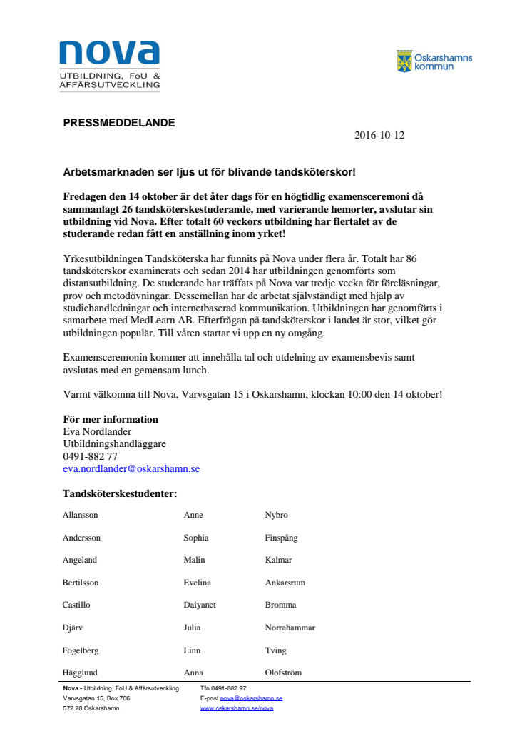 Fredagen den 14 oktober klockan 11:00 är det åter dags för en högtidlig examensceremoni då sammanlagt 26 tandsköterskestudenter, med varierande hemorter, avslutar sin utbildning vid Nova. Efter totalt 60 veckors utbildning har flertalet av studenterna redan fått en anställning inom yrket!