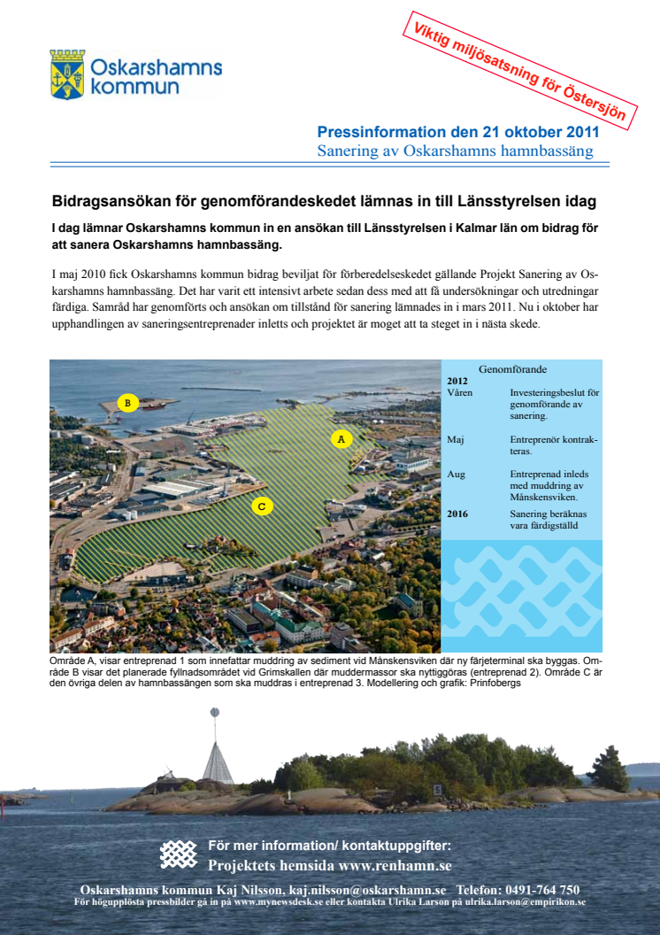 I dag lämnar Oskarshamns kommun in ansökan till Länsstyrelsen i Kalmar län om bidrag för genomförandeskedet.