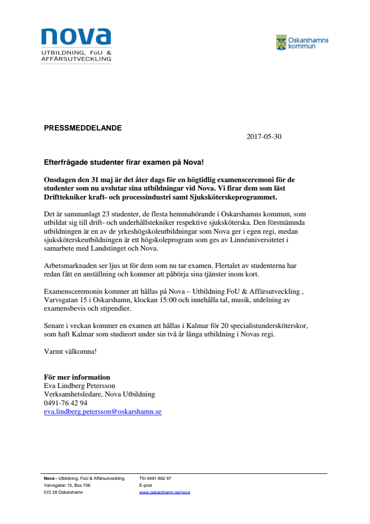 Onsdagen den 31 maj är det åter dags för en högtidlig examensceremoni för de studenter som nu avslutar sina utbildningar vid Nova. Vi firar dem som läst Drifttekniker kraft- och processindustri samt Sjuksköterskeprogrammet.