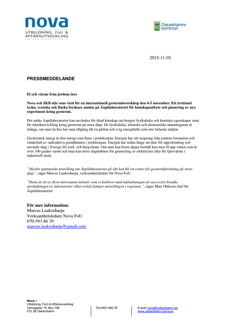 Nova och Svensk Kärnbränslehantering AB (SKB) står som värd för en internationell geotermiworskhop den 4-5 november. Ett trettiotal tyska, svenska och finska forskare samlas på Äspölaboratoriet för kunskapsutbyte och planering av nya experiment kring geotermi.