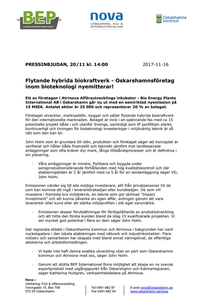 Ett av företagen i Atrinova Affärsutvecklings inkubator - Bio Energy Plants International AB i Oskarshamn går nu ut med en semiriktad nyemission på 15 MSEK. Antalet aktier är 25 000 och representerar 20 % av bolaget.