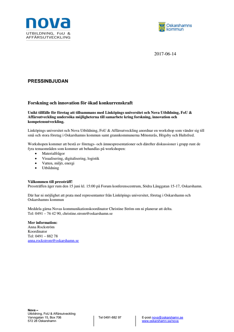 Unikt tillfälle för företag att tillsammans med Linköpings universitet och Nova Utbildning, FoU & Affärsutveckling undersöka möjligheterna till samarbete kring forskning, innovation och kompetensutveckling.