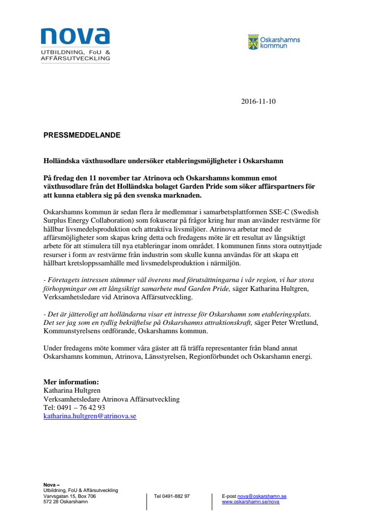 På fredag den 11 november tar Atrinova Affärsutveckling och Oskarshamns kommun emot växthusodlare från det Holländska bolaget Garden Pride som söker affärspartners för att kunna etablera sig på den svenska marknaden.