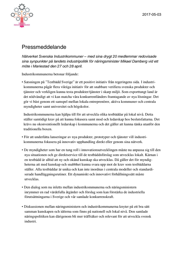 Nätverket Svenska Industrikommuner – med sina drygt 20 medlemmar- redovisade sina synpunkter på landets industripolitik för näringsminister Mikael Damberg vid ett möte den 28 april. I industrikommunerna pågår flera viktiga initiativ för att snabbare verifiera svenska produkter och tjänster och verkligen kunna testa produkter/tjänster i skarp miljö, som kräver samverkan med statliga myndigheter.