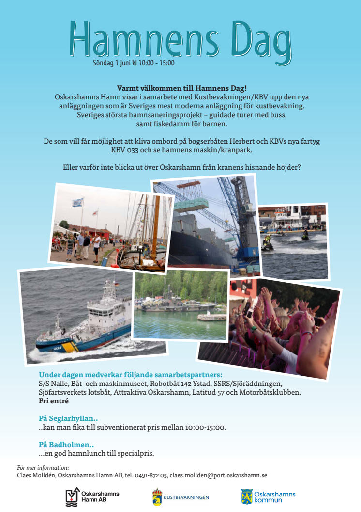 Varmt välkomna att träffa hamnsaneringsprojektet vid Hamnens dag i Oskarshamn den 1 juni 2014 kl 10.00-15.00. Vi finns på plats för att informera om den kommande saneringen av hamnbassängen. Vi har guidade rundturer i hamnen och för de små ordnar vi fiskdamm. Missa inte heller att träffa kustbevakningen, stiga ombord på bogserbåten Herbert och se Oskarshamn från kranens hisnande höjder.