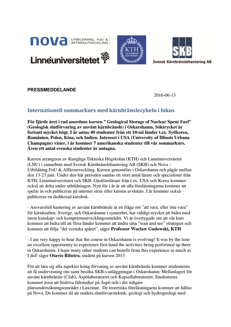 För fjärde året i rad anordnas kursen ” Geological Storage of Nuclear Spent Fuel” (Geologisk slutförvaring av använt kärnbränsle) i Oskarshamn. Söktrycket är fortsatt mycket högt. I år antas 40 studenter från ett 10-tal länder t.ex. Sydkorea, Polen, Kina, och Indien. Intresset i USA växer, i år kommer 7 amerikanska studenter till vår sommarkurs. Även ett antal svenska studenter är antagna.