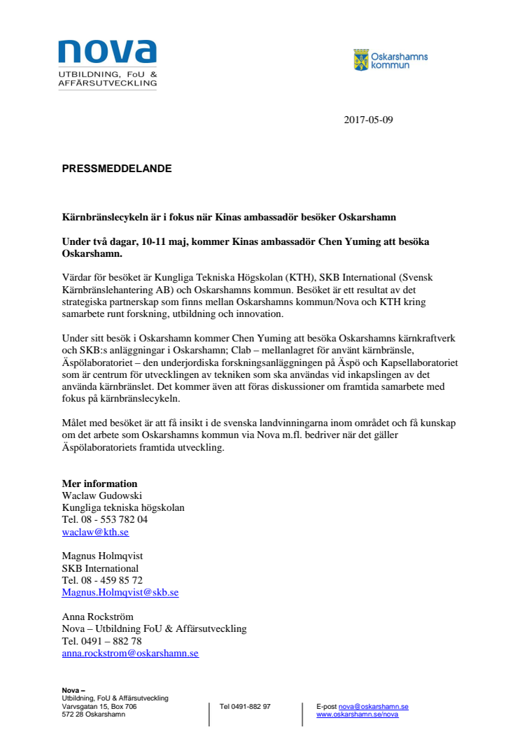 Kärnbränslecykeln är i fokus när Kinas ambassadör besöker Oskarshamn