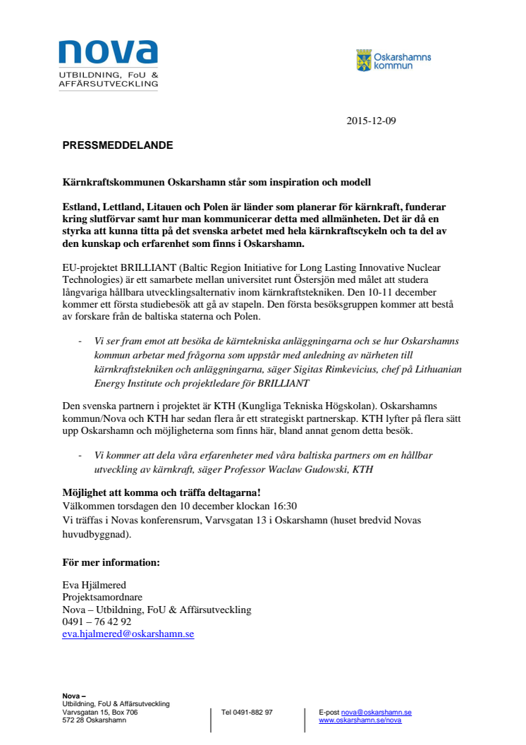 Estland, Lettland, Litauen och Polen är länder som planerar för kärnkraft, funderar kring slutförvar samt hur man kommunicerar detta med allmänheten. Det är då en styrka att kunna titta på det svenska arbetet med hela kärnkraftscykeln och ta del av den kunskap och erfarenhet som finns i Oskarshamn.