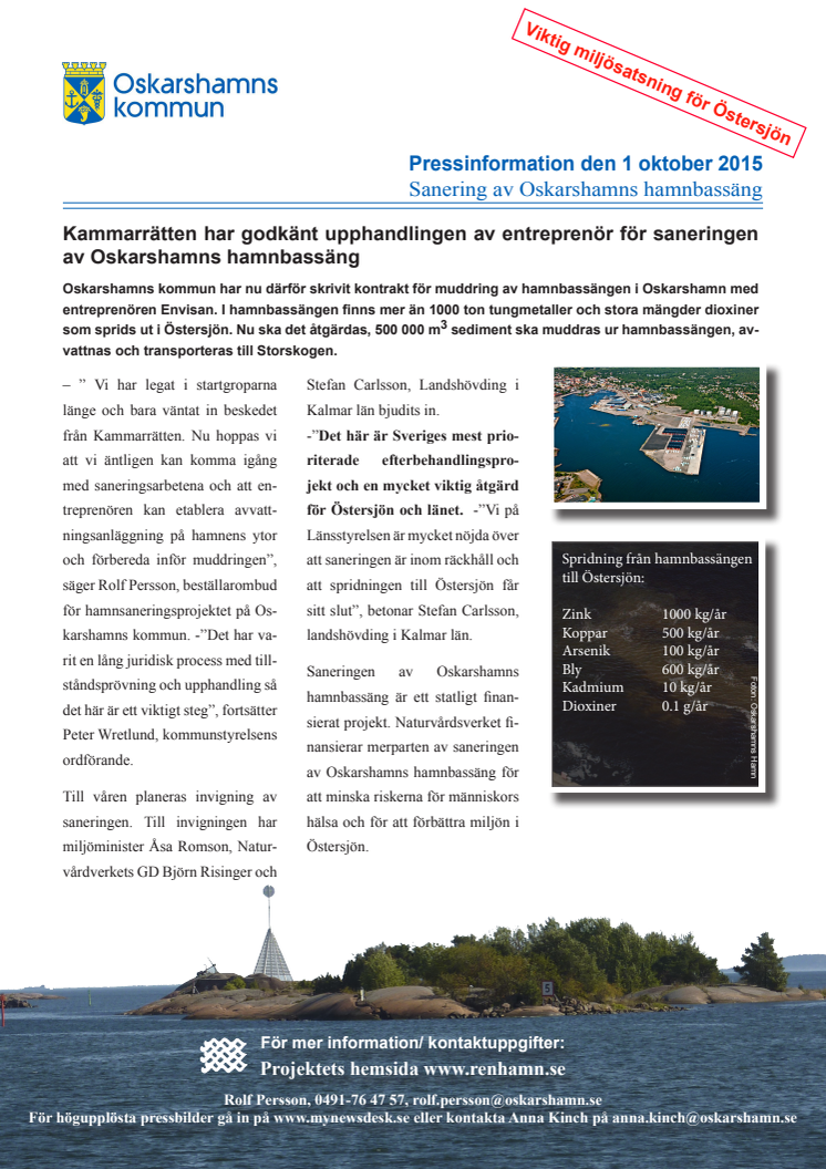 Oskarshamns kommun har nu därför skrivit kontrakt för muddring av hamnbassängen i Oskarshamn med entreprenören Envisan. I hamnbassängen finns mer än 1000 ton tungmetaller och stora mängder dioxiner som sprids ut i Östersjön. Nu ska det åtgärdas, 500 000 kubikmeter sediment ska muddras ur hamnbassängen, avvattnas och transporteras till Storskogen.