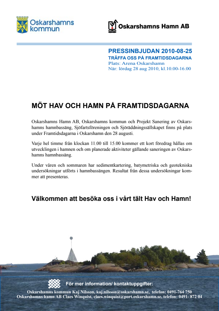 Den 28 augusti mellan 10.00-16.00 finns Oskarshamns kommun och Projekt Sanering av Oskarshamns hamnbassäng, Oskarshamns Hamn AB, Sjöräddningssällskapet och Sjöfartsföreningen på plats på Oskarshamns Arena och Framtidsdagarna. Besök oss i vårt tält Hav och Hamn. Varje hel timme från 11.00 till 15.00 håller vi ett föredrag om hamnens utveckling och resultat från undersökningar i hamnbassängen.