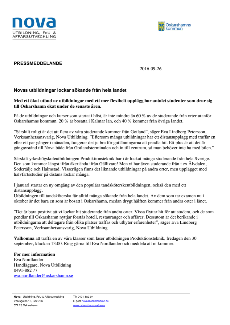 Med ett större utbud av utbildningar med distansupplägg, har antalet personer som söker sig till Oskarshamn för att studera ökat markant de senaste åren. Det gynnar vår region eftersom vi då kan erbjuda en större variation av utbildningar under längre tid. På de utbildningar som startat i höst är 60 % från orter utanför Oskarshamns kommun, 20 % bosatta i Kalmar län och 40 % från övriga landet.