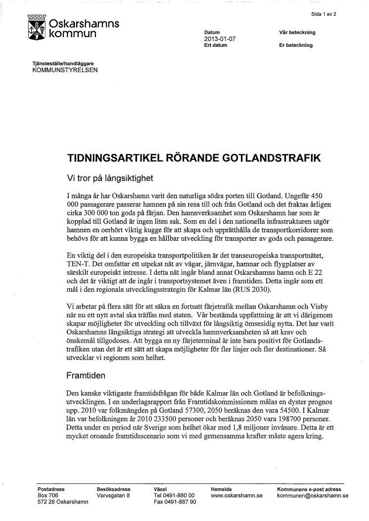 I många år har Oskarshamn varit den naturliga södra porten till Gotland. Oskarshamn arbetar på flera sätt för att säkra en fortsatt färjetrafik mellan Oskarshamn och Visby när nu ett nytt avtal ska träffas med staten. Därigenom skapar vi möjligheter för befokningsutveckling och tillväxt till ömsesidig nytta. En stabil infrastruktur är en bra grund att bygga på.