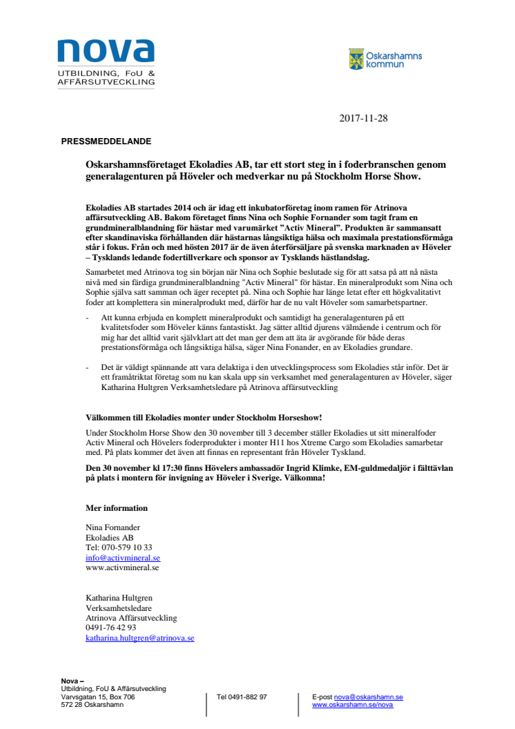 Oskarshamnsföretaget Ekoladies AB, tar ett stort steg in i foderbranschen genom generalagenturen på Höveler och medverkar nu på Stockholm Horse Show