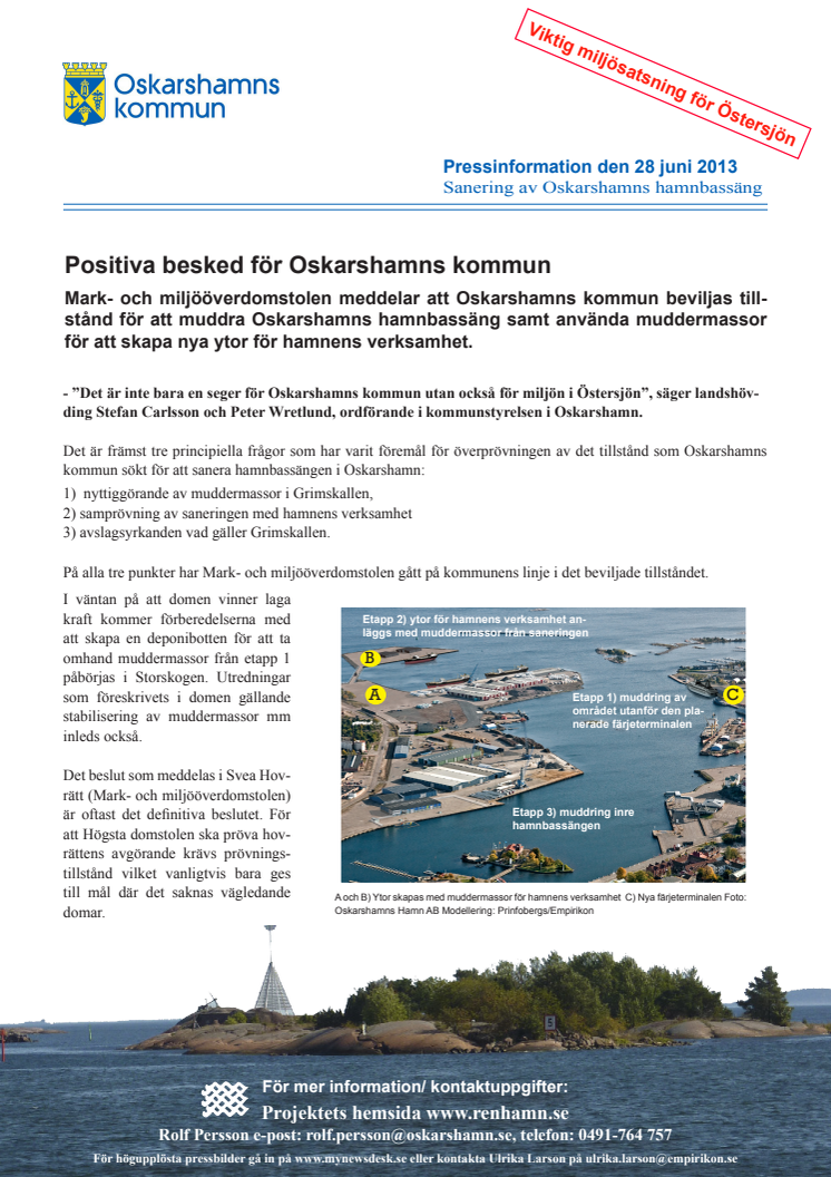 MMÖD meddelar att Oskarshamns kommun beviljas tillstånd för att muddra Oskarshamns hamnbassäng samt använda muddermassor för att skapa nya ytor för hamnens verksamhet. De är främst tre frågor som varit principiella i överprövningen, nyttiggörande av muddermassor, samprövning med hamnensverksamhet och avslagsyrkande för Grimskallen. På alla tre punkter har MMÖD gått på kommunens linje.