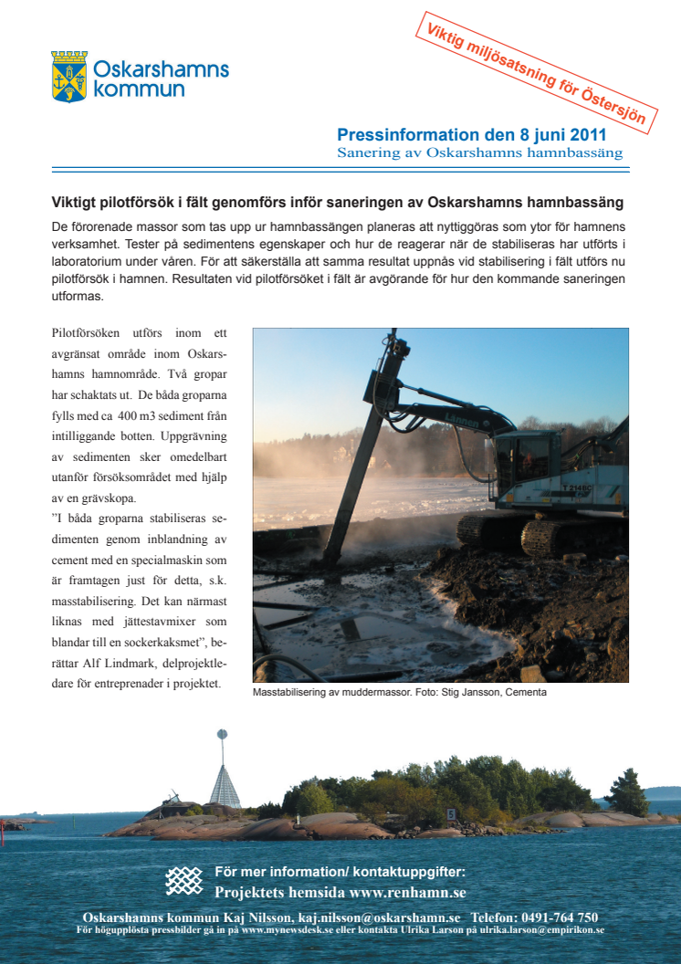 Pressinformation om stabiliseringsförsök i Oskarshamns Hamnbassäng