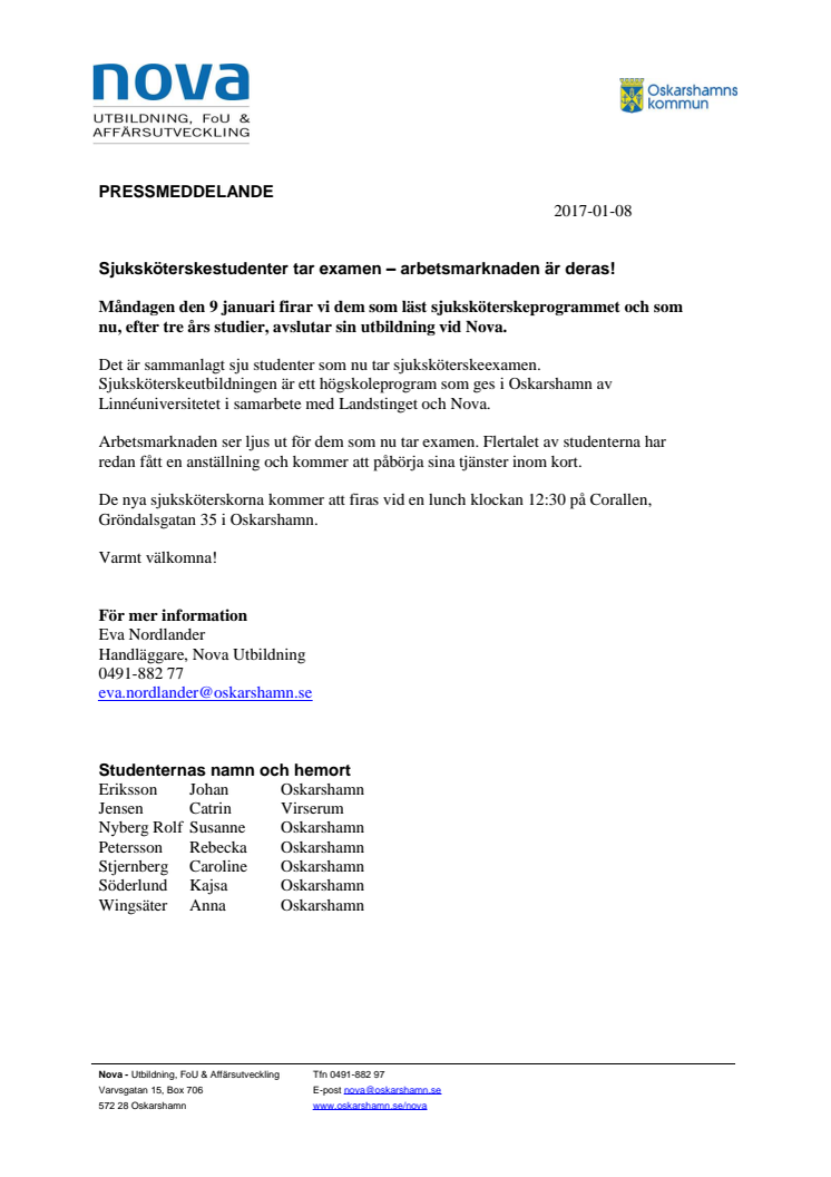 Måndagen den 9 januari firar vi dem som läst sjuksköterskeprogrammet och som nu, efter tre års studier, avslutar sin utbildning vid Nova.