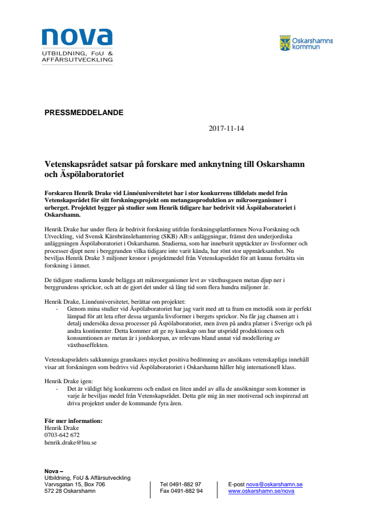 Forskaren Henrik Drake vid Linnéuniversitetet har i stor konkurrens tilldelats medel från Vetenskapsrådet för sitt forskningsprojekt om metangasproduktion av mikroorganismer i urberget. Projektet bygger på studier som Henrik tidigare har bedrivit vid Äspölaboratoriet i Oskarshamn.
