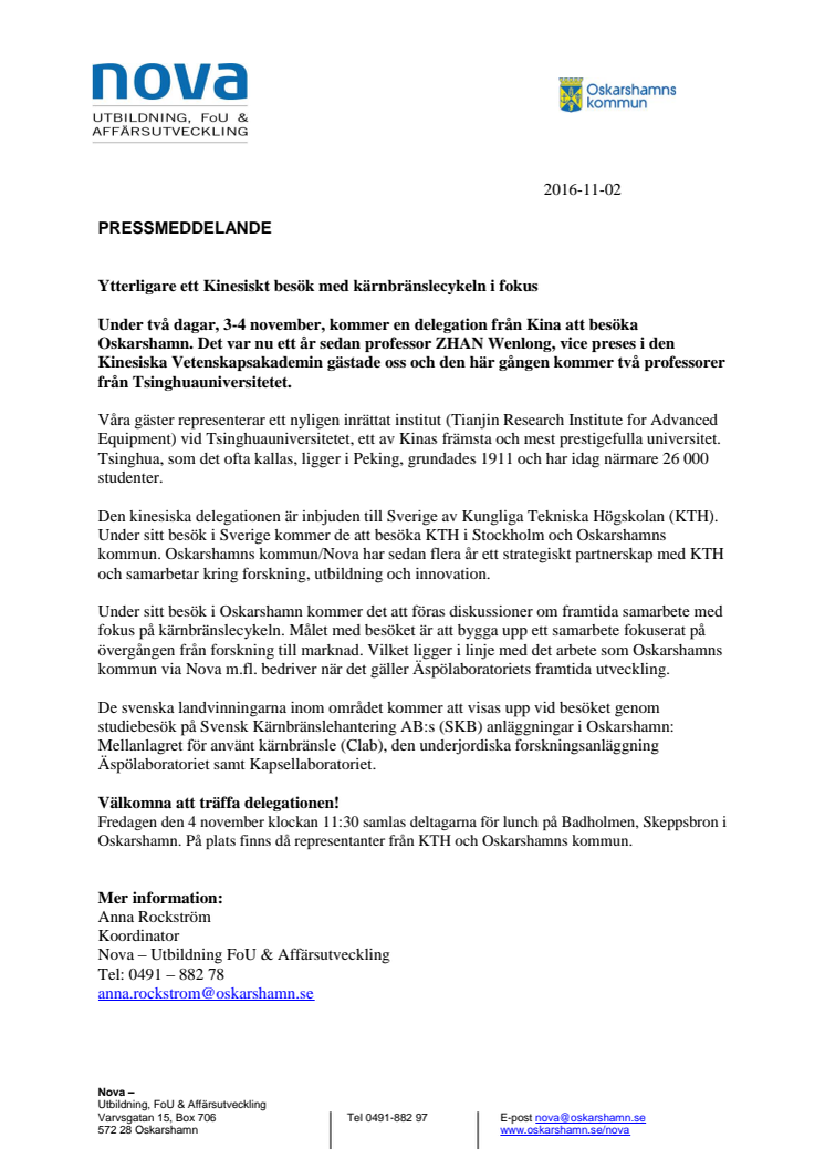 Under två dagar, 3-4 november, kommer en delegation från Kina att besöka Oskarshamn. Det var nu ett år sedan professor ZHAN Wenlong, vice preses i den Kinesiska Vetenskapsakademin gästade oss och den här gången kommer två professorer från Tsinghuauniversitetet.