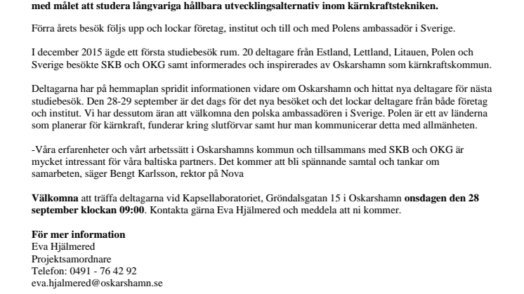 • Länder kring Östersjön informeras och inspireras av Oskarshamn som kärnkraftskommun
