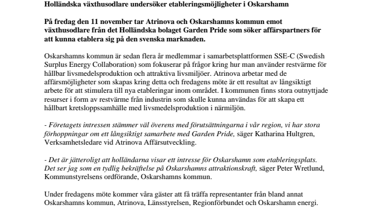 • Holländska växthusodlare undersöker etableringsmöjligheter i Oskarshamn