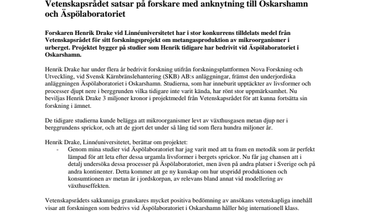 • Vetenskapsrådet satsar på forskare med anknytning till Oskarshamn och Äspölaboratoriet
