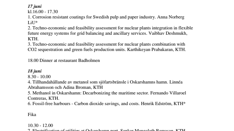 Arbetena är nu klara och den 17-18 juni besöker studenterna alltså Oskarshamn igen för att presentera sina resultat för varandra och representanter för näringslivet. Media hälsas välkomna att besöka oss under måndag-tisdag med möjlighet att prata med studenter och arbetsgivare. Deltar gör också Emma Björk, docent på institutionen för Kemi, fysik och biologi vid Linköpings universitet, Björn Laumert, professor på institutionen för energiteknik på KTH samt Jeevan Jayasuriya PhD från samma institution.