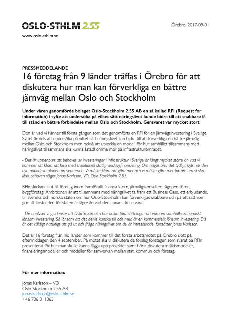 Under våren genomförde bolaget Oslo-Stockholm 2.55 AB en så kallad RFI (Request for information) i syfte att undersöka på vilket sätt näringslivet kunde bidra till att snabbare få till stånd en bättre förbindelse mellan Oslo och Stockholm. Den 4 september träffas 16 företag från 9 länder träffas i Örebro för att diskutera hur.