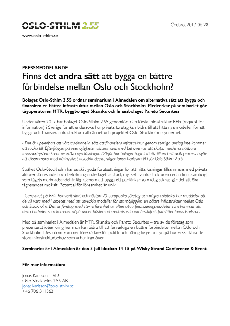Bolaget Oslo-Sthlm 2.55 ordnar seminarium i Almedalen om alternativa sätt att bygga och finansiera en bättre infrastruktur mellan Oslo och Stockholm. Medverkar på seminariet gör tågoperatören MTR, byggbolaget Skanska och finansbolaget Pareto Securities. Dessutom diskuteras behov och möjligheter med politik och näringsliv.