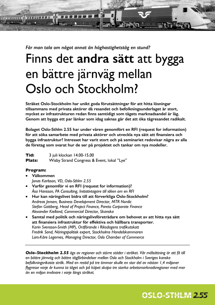 Våra traditionella sätt att finansiera infrastruktur kommer inte att räcka till. Bolaget Oslo-Sthlm 2.55 ordnar seminarium i Almedalen den 3 juli kl 14.00 på Wisby Strand Congress & Event om andra sätt att bygga en bättre förbindelse. På seminariet redovisar bland annat MTR, Skanska och Pareto hur de ser på projektet och tankar om nya modeller för att finansiera och bygga infrastruktur.