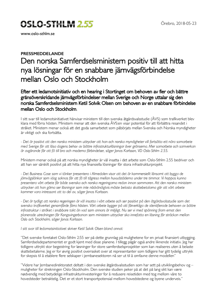 Efter ett ledamotsinitiativ och en hearing i Stortinget om behoven av fler och bättre gränsöverskridande järnvägsförbindelser mellan Sverige och Norge uttalar sig den norska Samferdselsministern Ketil Solvik Olsen om behoven av en snabbare förbindelse mellan Oslo och Stockholm.
