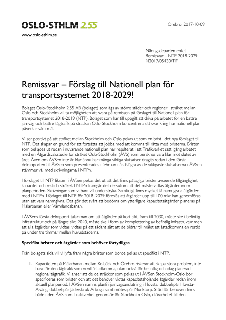 Vi ser positivt på att stråket mellan Stockholm och Oslo pekas ut som en brist i det nya förslaget till NTP. Det skapar en grund för att fortsätta att jobba med att komma till rätta med bristerna. I förslaget till NTP pekas det ut att det finns påtagliga brister avseende tillgänglighet, kapacitet och restid i stråket. I NTPn framgår det dessutom att det måste vidtas åtgärder inom planperioden.