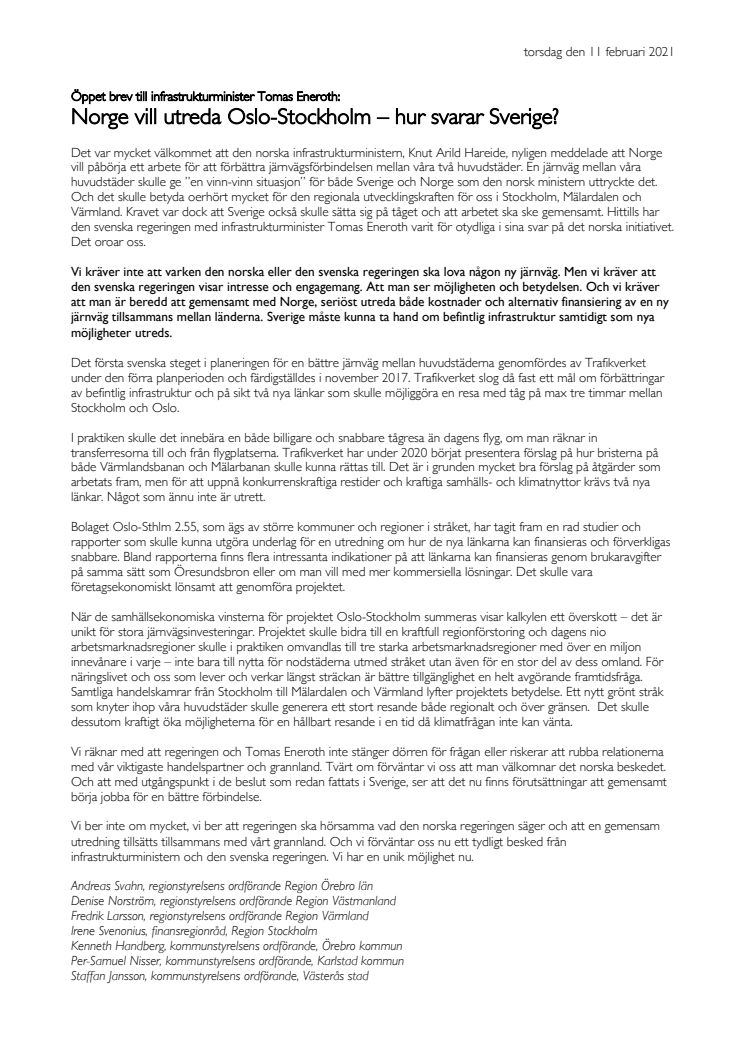 Företrädare för regioner och kommuner i stråket Oslo-Stockholm har skickat ett öppet brev till infrastrukturminister Tomas Eneroth. Nyligen meddelade den norska infrastrukturministern Knut Arild Hareide att den norska regeringen är villig att utreda en modern järnvägsförbindelsen mellan Oslo och Stockholm. Förutsättningen för att arbetet ska påbörjas är dock att det sker gemensamt med Sverige.