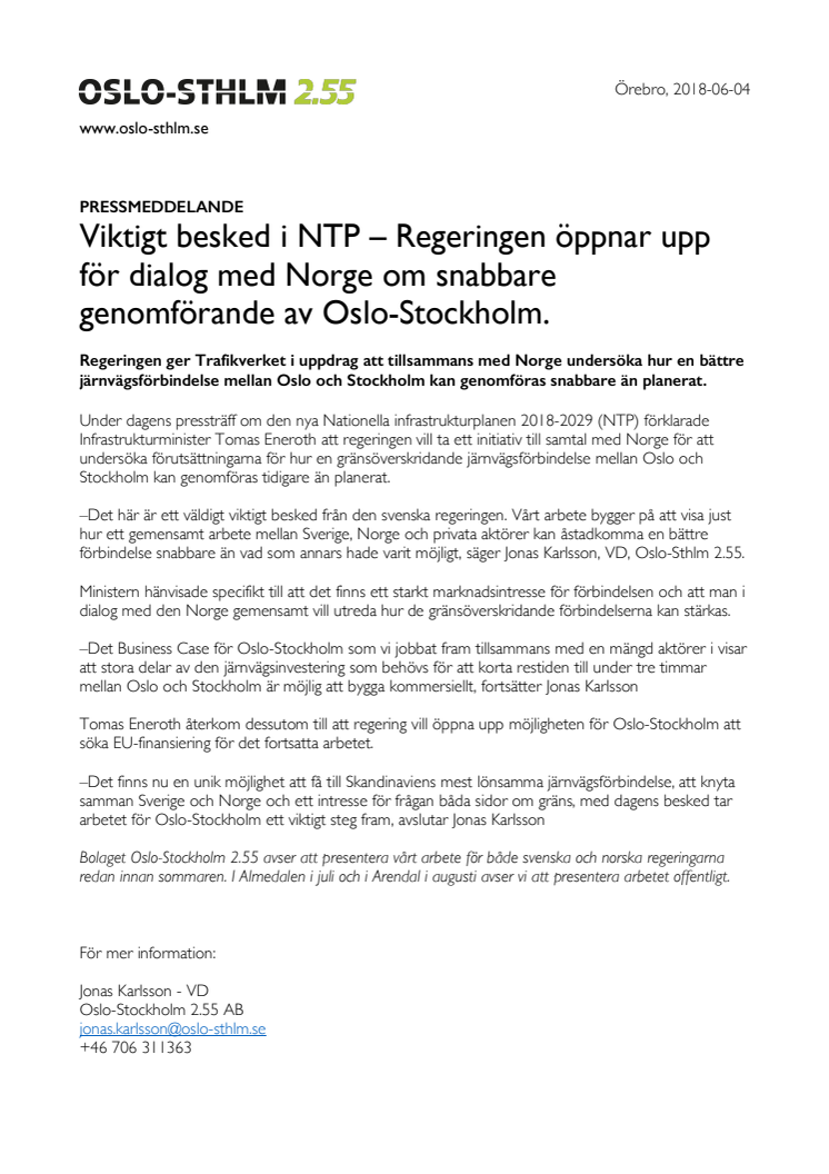 Viktigt besked i NTP – Regeringen öppnar upp för dialog med Norge om snabbare genomförande av Oslo-Stockholm