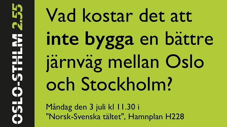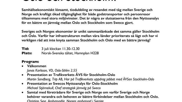 Samhällsekonomiskt lönsamt, tiodubbling av resandet med tåg mellan Sverige och Norge och kraftigt ökad tillgänglighet för gods och personresor. Bolaget Oslo-Sthlm 2.55 ordnar seminarium i Almedalen den 3 juli kl 11.30 i "Svensk-Norska tältet" på Hamnplan i Visby om vad vi har att vinna på bättre förbindelser mellan Sverige och Norge och inte minst mellan Oslo och Stockholm.