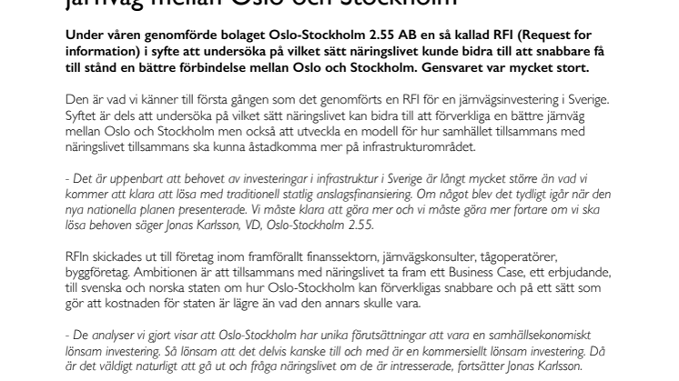 Under våren genomförde bolaget Oslo-Stockholm 2.55 AB en så kallad RFI (Request for information) i syfte att undersöka på vilket sätt näringslivet kunde bidra till att snabbare få till stånd en bättre förbindelse mellan Oslo och Stockholm. Gensvaret var mycket stort.