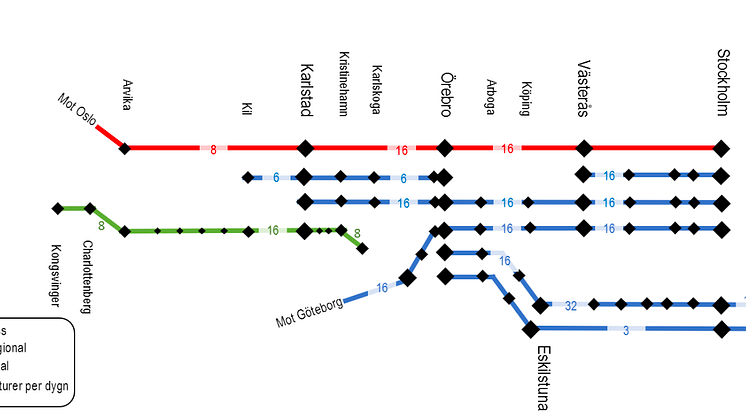 - Det skulle innebära ett rejält uppsving för tågtrafiken i stråket både eftersom kapaciteten ökar och eftersom resandet ökar kraftigt. Mellan Västerås och Stockholm samt mellan Örebro och Stockholm skulle antagligen tågtrafiken fördubblas och det skulle finnas underlag för tåg var 15e minut. Från Karlstad till Stockholm skulle tågtrafiken kunna fyrdubblas med underlag för ett tåg var 30e minut, det skulle vara nästa stora steg efter att Mälarbanan byggdes i slutet av 1990-talet, fortsätter Jonas Karlsson.