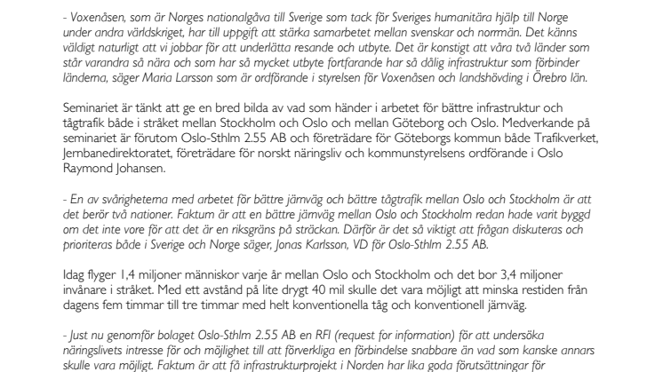 Seminariet är tänkt att ge en bred bilda av vad som händer i arbetet för bättre infrastruktur och tågtrafik både i stråket mellan Stockholm och Oslo och mellan Göteborg och Oslo. Medverkande på seminariet är förutom Oslo-Sthlm 2.55 AB och företrädare för Göteborgs kommun både Trafikverket, Jernbanedirektoratet, företrädare för norskt näringsliv och kommunstyrelsens ordförande i Oslo Raymond Johansen.