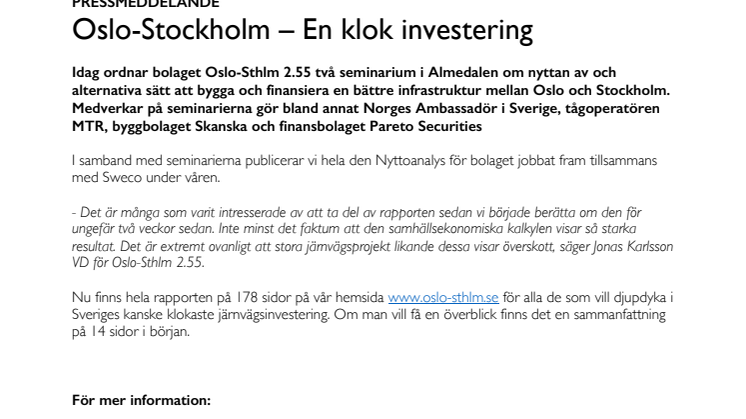- Det är många som varit intresserade av att ta del av rapporten sedan vi började berätta om den för ungefär två veckor sedan. Inte minst det faktum att den samhällsekonomiska kalkylen visar så starka resultat. Det är extremt ovanligt att stora järnvägsprojekt likande dessa visar överskott, säger Jonas Karlsson VD för Oslo-Sthlm 2.55.