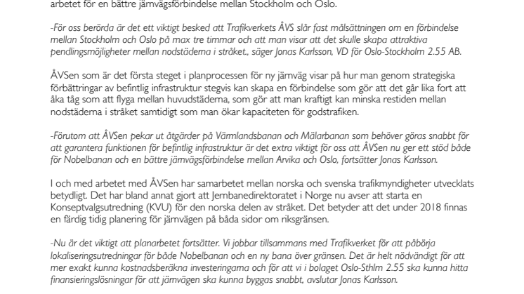 -För oss berörda är det ett viktigt besked att Trafikverkets ÅVS slår fast målsättningen om en förbindelse mellan Stockholm och Oslo på max tre timmar och att man visar att det skulle skapa attraktiva pendlingsmöjligheter mellan nodstäderna i stråket, säger Jonas Karlsson, VD för Oslo-Stockholm 2.55 AB.