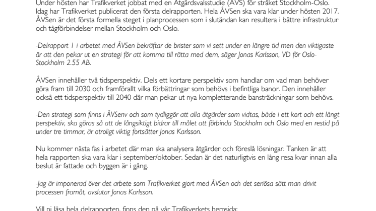 Under hösten har Trafikverket jobbat med en Åtgärdsvalsstudie (ÅVS) för stråket Stockholm-Oslo. Idag har Trafikverket publicerat den första delrapporten. Hela ÅVSen ska vara klar under hösten 2017. ÅVSen är det första formella steget i planprocessen som i slutändan kan resultera i bättre infrastruktur och tågförbindelser mellan Stockholm och Oslo.