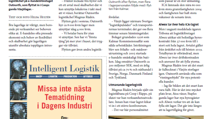Bra lagerläge är viktigt. E-handelns ofta pressade ekonomi och behov av flexibilitet och skolbarnet gör lagerlägen utanför absoluta topplägen intressanta. När e-handelsföretaget Outnorth växte ur sitt lager i Kalmar föll valet på Coops f.d regionlager i Växjö, en 26 000 kvm lagerlokal.