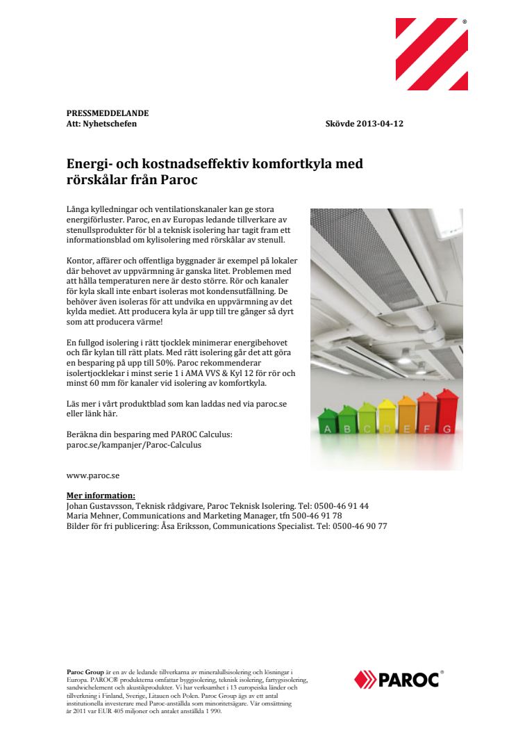 Att producera kyla är upp till tre gånger så dyrt som att producera värme! Långa kylledningar och ventilationskanaler kan ge stora energiförluster. Paroc, en av Europas ledande tillverkare av stenullsprodukter för bl a teknisk isolering, har tagit fram ett informationsblad om kylisolering med rörskålar av stenull.